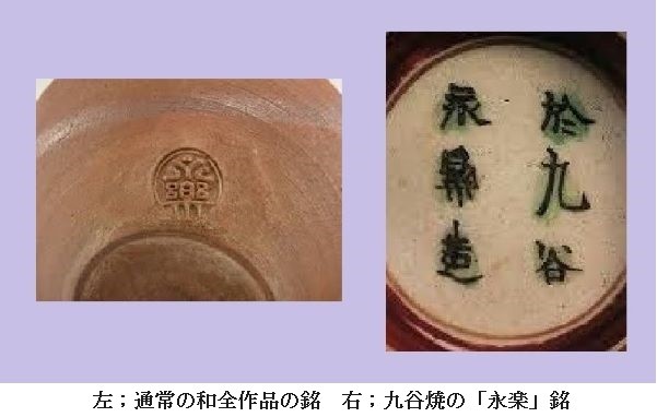 「九谷」銘が明確に書き入れるようになった最初が京焼の名工 永楽和全によって制作された九谷本窯の作品でした。和全が慶応2年(1866)に大聖寺藩の御用窯である山代の九谷本窯に招聘されたとき、その窯で制作された作品に「於九谷」または「九谷」の銘を書き入れました。おそらく、和全は、吉田屋窯以降、「九谷焼」と呼ばれていたことから、「九谷焼」の産地で自分が製作したことを示めすためにそうした銘を書き入れたと考えられます。
