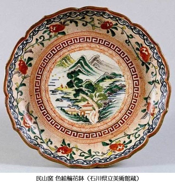 民山窯は、文政5年(1822)、加賀藩士 武田秀平が金沢に開いた窯です。青木木米が京都に戻ってからも、春日山窯が呉須赤絵写しや日用雑器を焼き続けいたものの、秀平は春日山窯が短期間で閉じられたことを惜しみ、磁器の製造を金沢で再興することを思い立ったといわれます。そこ至るまでは秀平が仕えた加賀藩老の期待(磁器窯の再興)もあったと考えられます。秀平という一介の藩士だけで陶業を興すには相当の資金が要したからです。