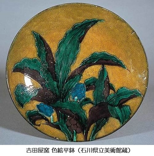 本多貞吉の薫陶を受けた、粟生屋源右衛門と養子の本多清兵衛によって開かれた吉田屋窯の作品はやや青黒ずんだ素地に落ち着いた絵の具を厚く盛り上げているという特色をもち、古九谷よりも一層落ち着いた趣を感じさせながらも、彩度や明度の点で絵の具相互がよく調和していることがうかがえられます。