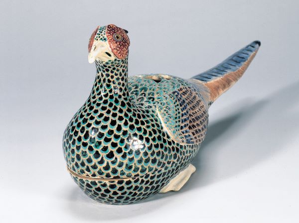 柿右衛門が色絵磁器を焼き始めてから間もなく、京焼の御室焼(おむろやき)で野々村仁清が初めて色絵陶器を焼きました。この色絵陶器は白釉が掛けられたやや卵殻色の下地(素地)に、赤、緑、青、金などで絵付されました。