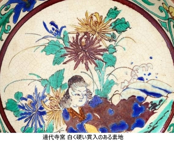佐野赤絵の作品は佐野で素地窯ができる前と後では変わったと思われます。当初は小野窯などから素地の供給を受けたと考えられ、上の画像のように、伊三郎の初期の作品の素地は真っ白であっても硬い磁胎でなく貫入も見られました。その後に築かれた佐野窯の素地を用いた作品とははっきりと異なりました。