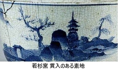 貞吉は、京都の寅吉(後に吉田屋窯へ移りました)、肥前平戸の平助、紀伊熊野の虎吉ら磁器先進地で活躍した陶工を呼び寄せて窯の性能を高め続けました。当初、若杉窯の素地には淡い卵黄色で不規則な貫入があり、染付には若杉窯特有の荒い貫入(*)が多く入ったものが目立ち、染付は黒味がかった青で発色しました。これは呉須に含まれる不純物、素地に含まれる成分、窯の温度などが影響し合って染付の色に濃淡の変化を起こさせたことによるとわかっており、また、貫入は釉薬と温度に係わるとみられ、若杉窯の染付の多くでは釉薬が厚く施釉されたことも影響したと考えられます。