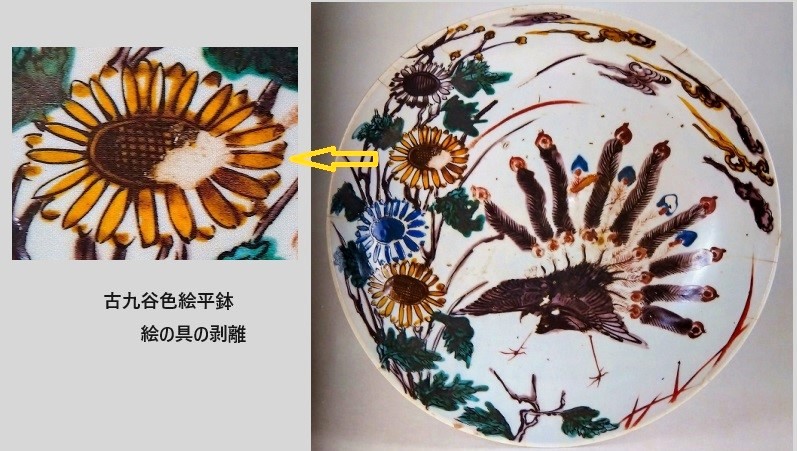 また、仕上がった素地に絵の具で絵付したとき、素地に融着した釉薬が絵の具と同一物ではないため、約800℃で焼いて溶融した後、絵の具の一部が素地から剥離した作品(上の画像)がありました。