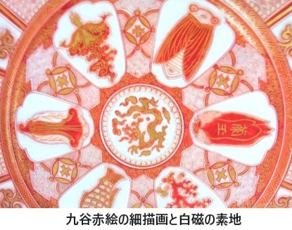 明治中期までに、江沼地方では“九谷赤絵”の細描画が竹内吟秋、浅井一毫、そして二人の門人らによってその技法が確立しました。二人の名工は九谷陶器会社において“九谷赤絵”になくてはならなかった素地を陶工 大蔵寿楽らと協業して造りました。その素地は透明なガラス層で覆われた白磁で、繊細な赤絵を描くことに適したものでした。作品の表面には貫入がなく絵の具の剥離もなく「赤色」の線描が鮮やかに浮かび上がったように発色しました。この絵付様式は、存続していた伝統的な九谷焼の生産方式(素地造りから絵付までの窯元での一貫生産)の下、どちらも名工と呼ばれた陶工と陶画工が技術力を発揮して素地を造る環境があったからと考えらます。