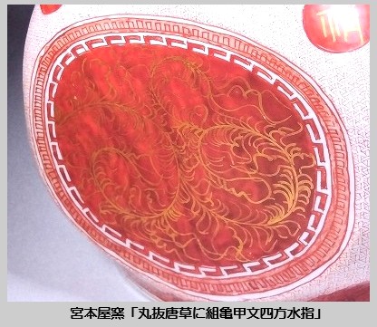 そして「八郎手」には、上の図案のように、華美にならない程度に金彩をうまくほとんどの作品に取り入れています。金泥で線を描き、あるいは文字(福・禄・寿など)を書いています。金彩が様々な要因によって、金色がくすんだり、剥がれたり、溶けたりすることがあったので、二度焼きされていました。赤色釉薬を除く色釉が1200℃前後の高温で、金彩は800℃前後で焼き付けられるため、金彩の施された色絵は二度焼きされ、多くの手間と時間が費やされました。このため“べんがら”の焼き付け温度が700~800℃前後で、金彩と似通った温度であったことから、八郎は金彩をよく施しました。金彩の焼成温度を経験的に突き止めたと見られ、一度焼で金彩を焼き付けたといわれます。ただ、宮本屋窯より早く赤地金彩や金襴手の制作を始めた近隣の木崎窯の木崎卜什(*)からこうした技法を修得した可能性も考えられますが、詳細は不明です。